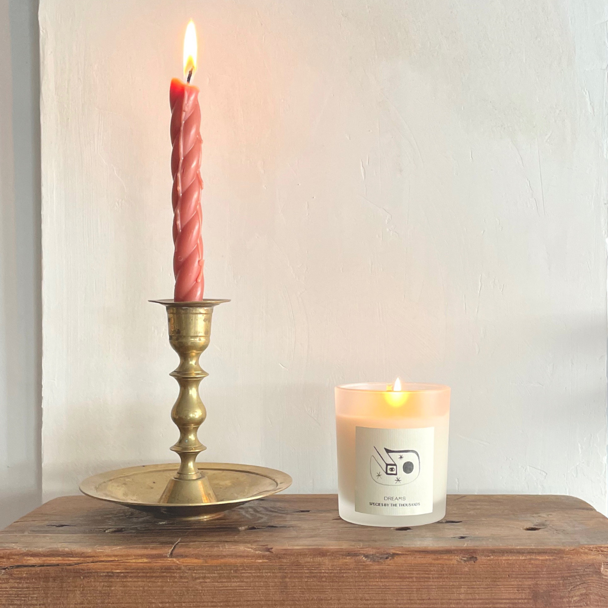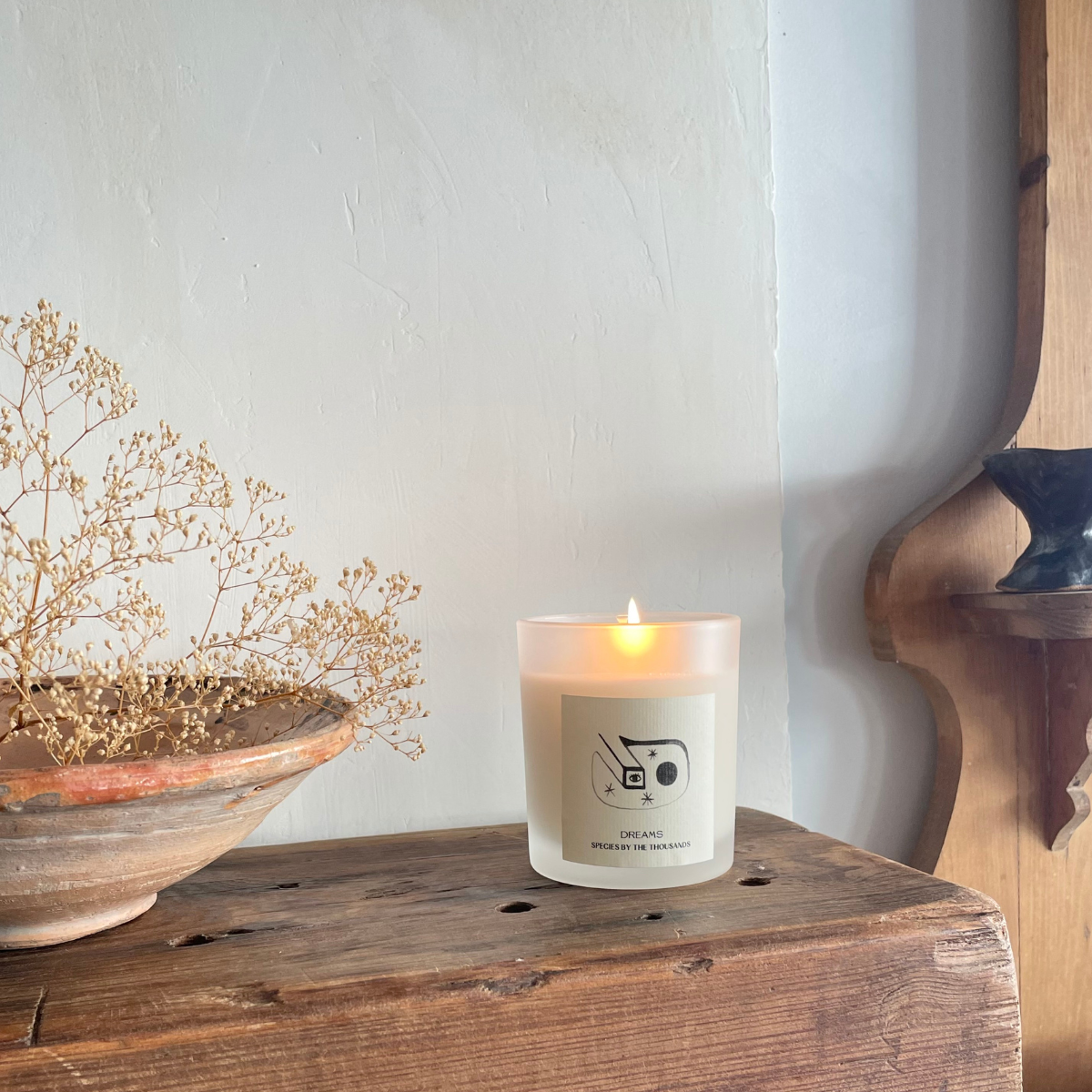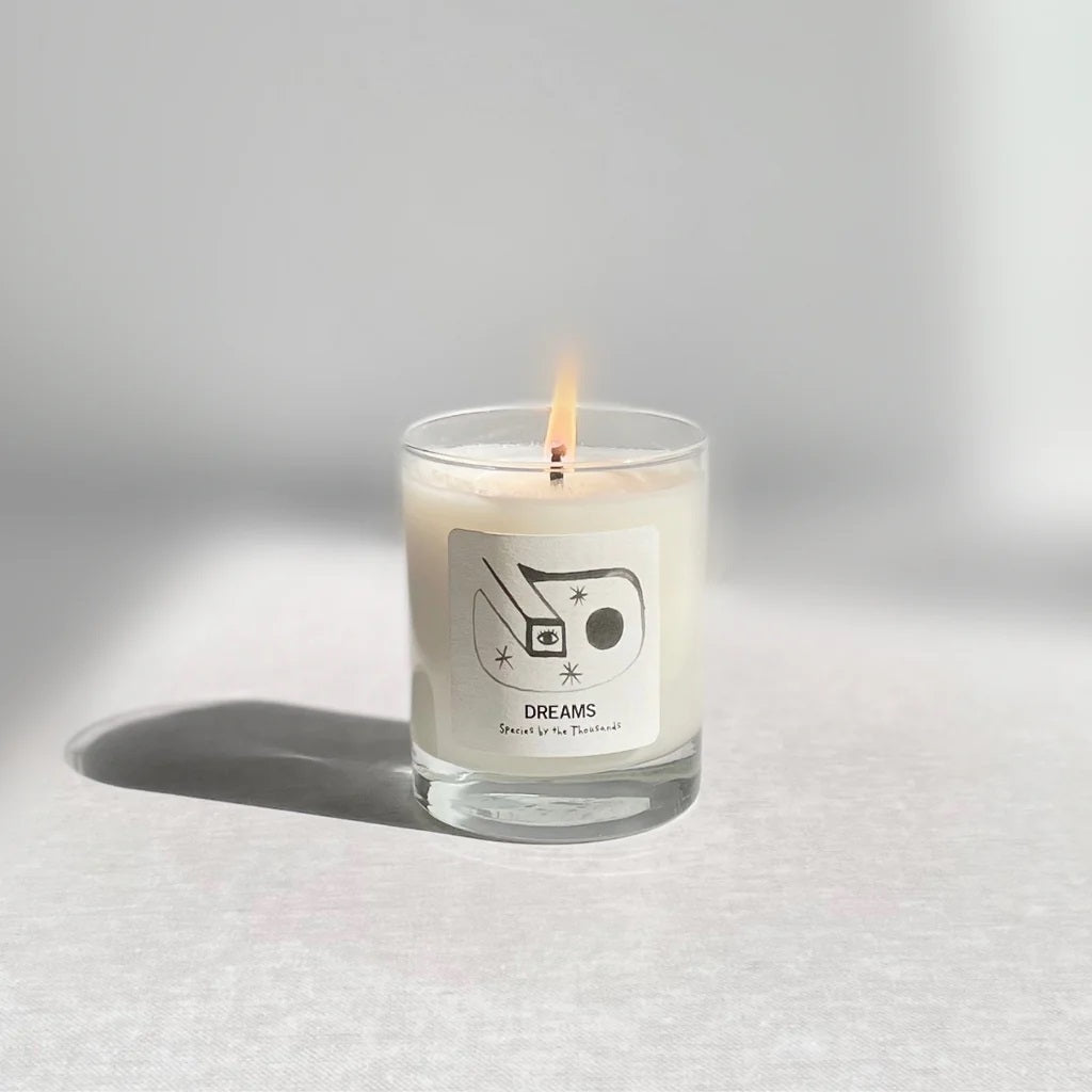⽩い曇りガラスの容器に、 Species by the Thousandsオリジナルのイラストがデザインされています。